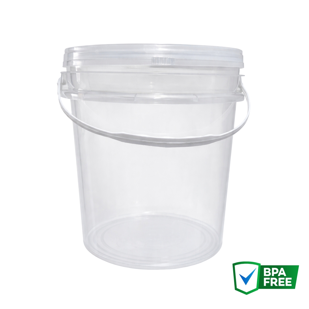 Balde Plástico de 5 Litros Transparente redondo com alça e lacre no balde.