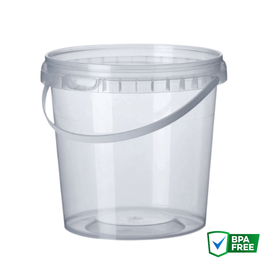 Balde Plástico de 2.200 Litros Transparente redondo com alça e lacre no balde.